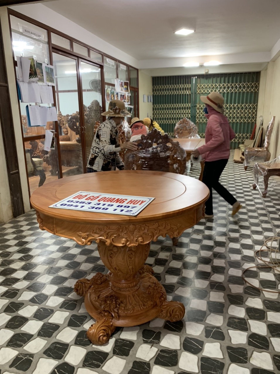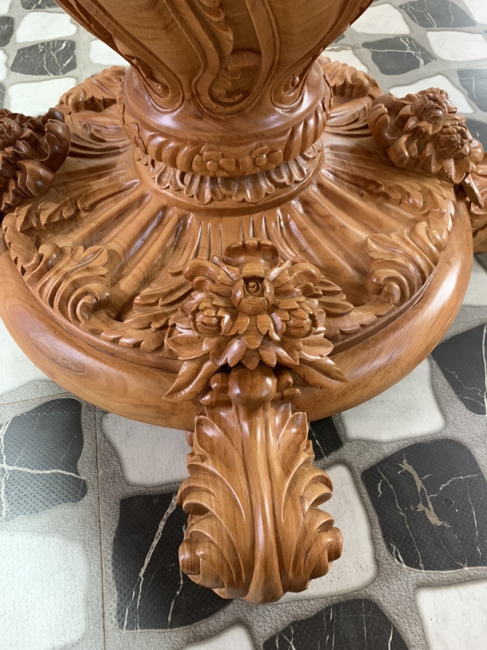 – Phía dưới chân bàn tròn trang trí sảnh gỗ gõ đỏ là một tác phẩm nghệ thuật. Từng họa tiết, hoa văn đều được chế tác một cách tỉ mỉ, thủ công 100% dưới bàn tay tài hoa của đội ngũ nhân công làng nghề Hải Minh với hàng chục năm kinh nghiệm.