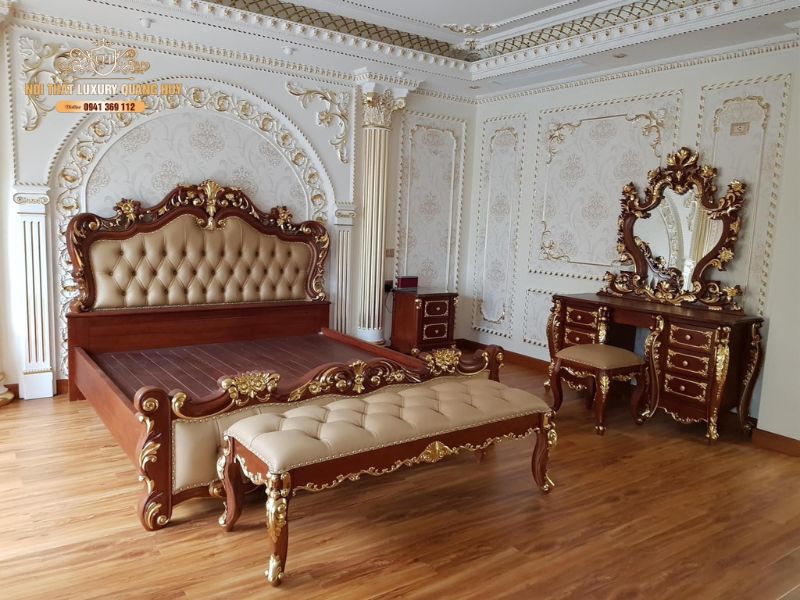 Không chỉ cung cấp các mẫu giường tân cổ điển gỗ gõ đỏ, Quang Huy còn nhận thi công trọn gói nội thất biệt thự luxury cao cấp, bao gồm ốp trần, ốp tường, nội thất phòng khách, phòng thờ… Đội ngũ thợ lành nghề tại làng nghề Hải Minh cam kết chăm chút từng chi tiết, đảm bảo sản phẩm đạt chuẩn cao nhất.